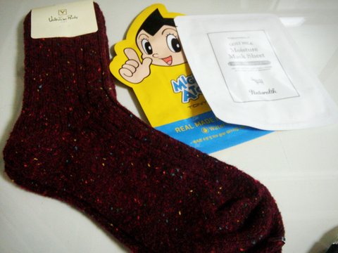 엄마 오늘 시내 돌아다니다가 발 시렵다는 엄마 생각나서 양말 하나 샀어ㅎㅎ 니트양말에다가 발목도 긴 거라서 발 덜 시려울 거야 마스크팩은 나랑 똑같은 거다!! 나한테 카드 빌려줬는데 이거 밖에 못 줘서 미안ㅋㅋ 다음에는 더 좋은 거 사줄게 엄마 사랑해♥
