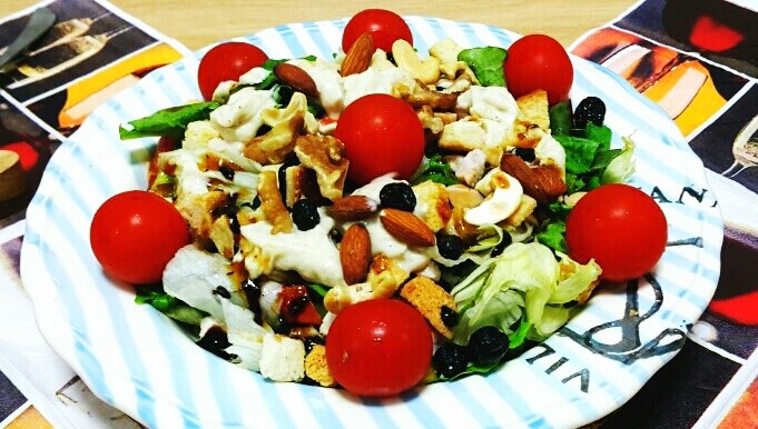 샐러드채소, 견과류, 방울토마토, 닭가슴살, 크루통 + 오리엔탈소스, 발사믹 글레이즈로 만들어 본