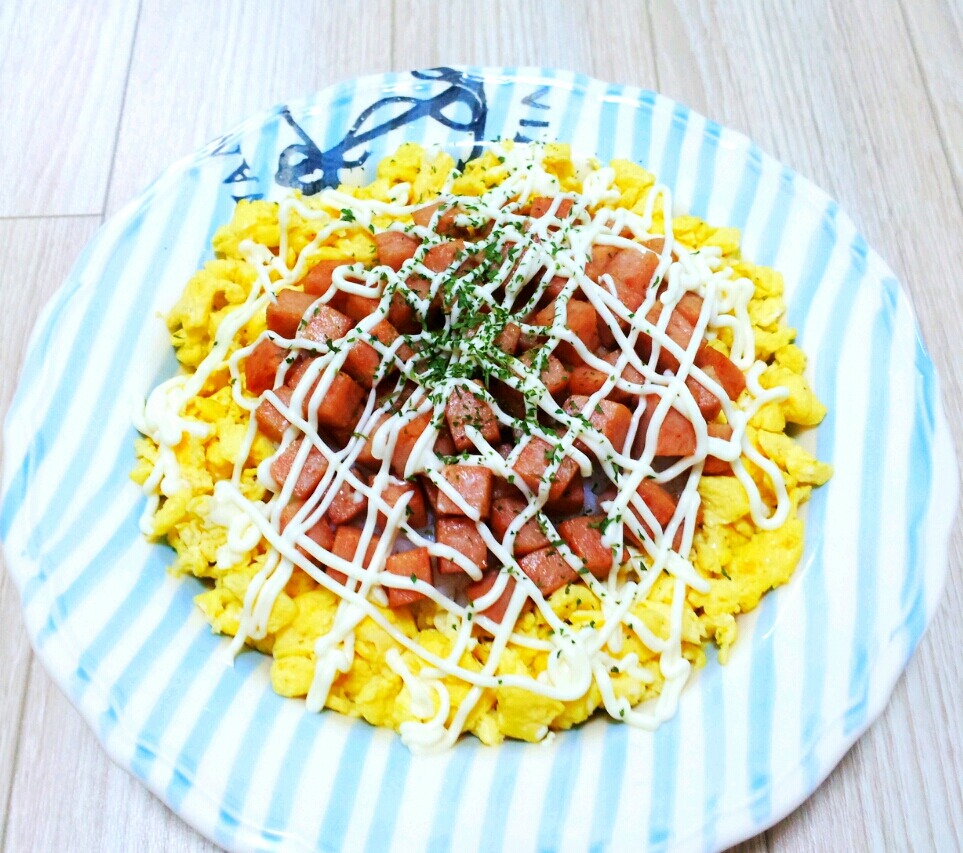 밥 위에 간장베이스 소스로 졸인 양파를 얹고, 큐브모양으로 구운 스팸과 에그 스크램블로 덮어준 후