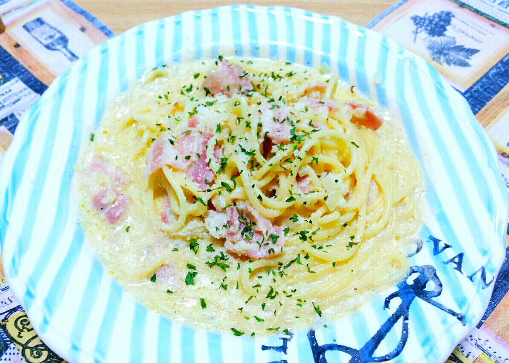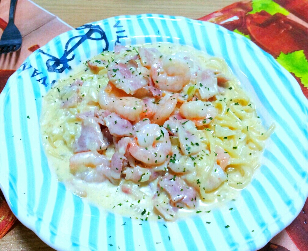 마늘, 양파를 올리브유에 볶아서 향을 뽑고~ 베이컨, 버터, 생크림, 체다치즈, 파마산치즈 넣고~ 소금, 후추로 간을 해준 그냥 버젼과 새우추가 푸짐한 버젼의 크림파스타 에요 ㅎㅎ