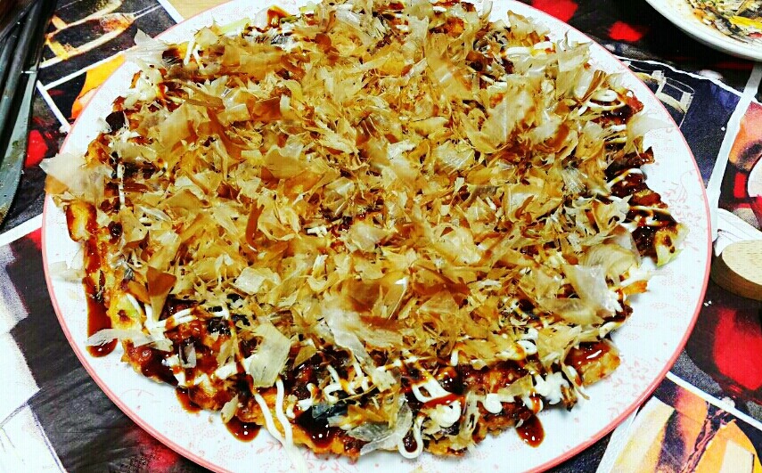 부침가루에 계란을 더한 반죽에 양배추, 베이컨, 오징어, 새우를 넣고 부쳐낸 후~ 데리야끼소스, 마요네즈 라인 뿌리고 가쓰오부시를 얹어서 마무리를 해 본 오코노미야끼 입니다 ^^