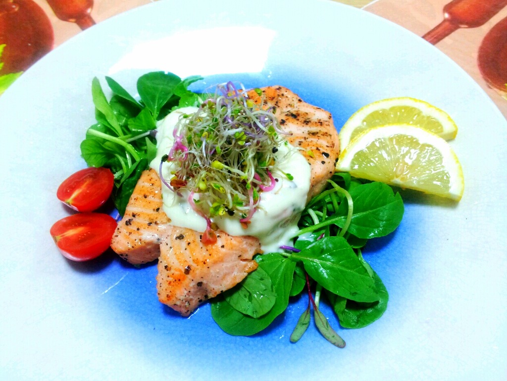 연어에 소금,후추간을 한 후 굽고, 타르타르소스를 곁들인 연어스테이크 에요 ㅎㅎ