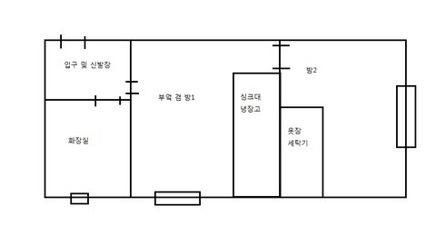 이렇습니다. 바깥쪽에 직사각형 네모가 창문이구요. 안쪽에 나란히 있는 줄은 방문입니다.