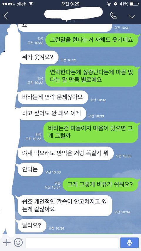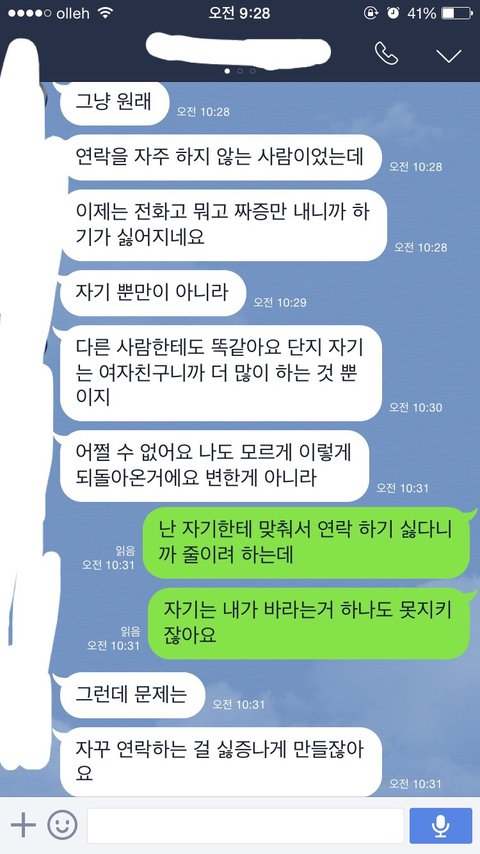 자신은 원체 연락을 잘 안하는 타입이라고 변한게 아니라 이게 자신의 모습이라며 연락을 죽어도 자주 못해주겠다 우기길래 그래 그럼 이해할테니 하루에 전화 한통 하자, 라고 말했더니 그것도 싫다네요 삼주동안 전화 한번을 안하더라구요. 그러고선 제가 왜그러냐 물으면 자신은 원래 그런다 라고 답하구요