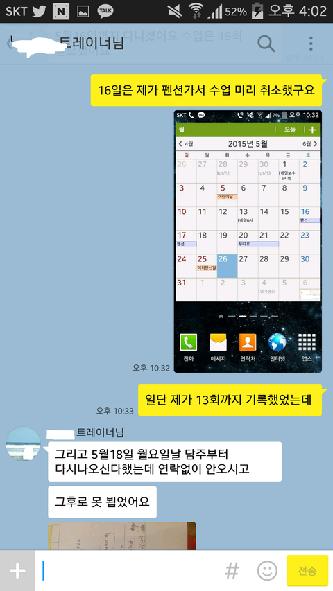 오늘 증명자료 소보원에 보낼려고 하니깐 ㅋㅋㅋㅋ 8월달 대화내용인데