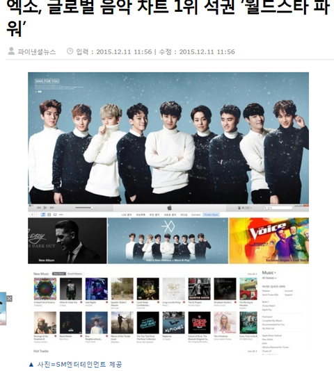 지난 10일 자정 전 세계에 공개된 엑소의 새 앨범 ‘싱포유(Sing For You)’는 발매 전날부터 세계 아이튠즈를 대상으로 한 월드와이드 아이튠즈 앨범 차트에서 13위를 차지해 눈길을 끌었다.