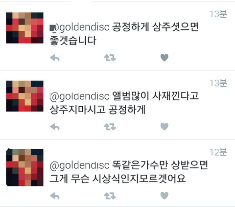 골든디스크 뜻을 모르나? 이거 인기투표나 다른 지표 배제한 채 순전히 음반판매량으로 공평하게 상 주자는 취지로 만든 시상식인데. 요즘은 골든디스크도 투표 들어가는지 어쩌는지 모르겠지만 초창기엔 무조건 음판량만 따진 시상식임.
