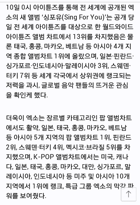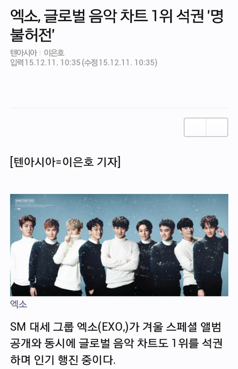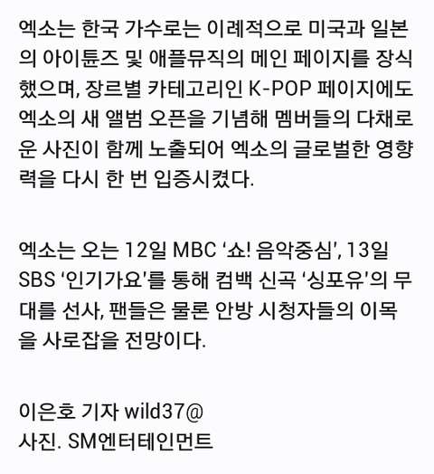 엑소, 글로벌 음악 차트 1위 석권 '명불허전'