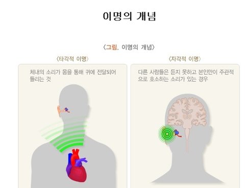 밖에서는 소리가 나지 않는데 귀에서 소리가 들리는 증상이 이명증(귀울림)이다. 시끄러운 곳에 오래 노출되거나 스트레스, 과다한 긴장 혹은 과로가 겹칠 때 이명증이 많이 나타난다. 그 외에 질병이나 약물에 의해 청각 신경이 손상되어 나타나기도 하며 노인성 변화로 인해 생기기도 한다. 소염 진통제, 항생제, 항함제, 피임약, 항결핵제 등이 이명을 일으킬 수 있고 뇌 손상 후유증으로 이명증이 생길 수도 있다. 높은 음의 이명이 있을 경우 귀뚜라미 소리나 매미 우는 소리가 들리며 저음의 이명인 경우 바람 소리나 매미 물 소리가 들린다. 소리는 몇 초간 들린 후 멈추는 경우에서부터 매일 계속 들리는 경우까지 다양하며 심한 경우에는 시끄러워서 잠들지 못하는 경우도 있다.