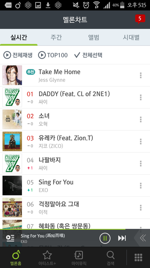 메엘론 차트 우리 5위임