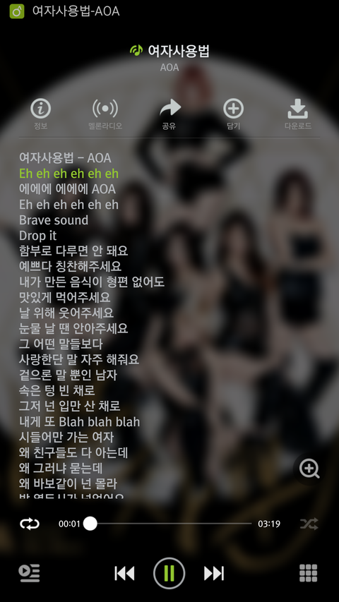 나도 주변에서 추천해서 들어봤는데 역시나 사스가 갓초아.. 초아는 역시. 사실 AOA는 블랙 (밴드)이 짱이지.. MOYA가 굉장히 좋았는데 요즘은 블랙보다 화이트 (댄스)를 밀어서ㅠㅠ 유경이도 함께하는 밴드를 보고싶다!!! 에펜씨!!! 제발!!!