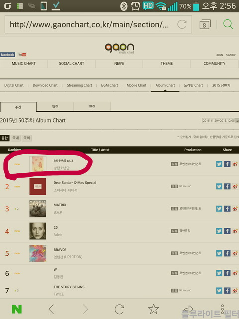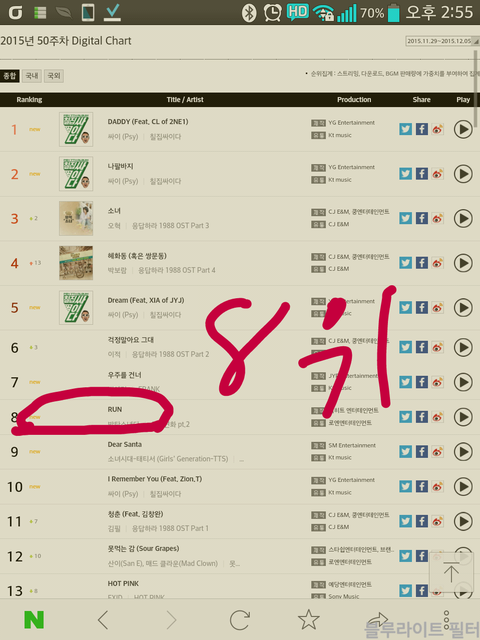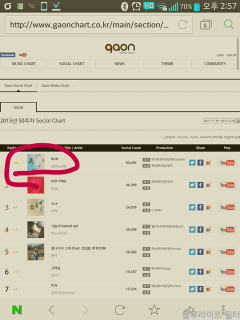 우리가 가온소셜차트가 1위인데 이게 그 sns점수가 포함된거야.