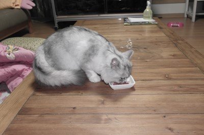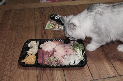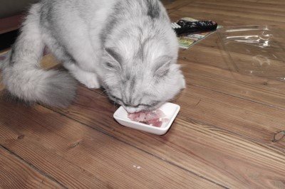 잘게 잘게 썰어줬습니다. 생고기, 광어만 좋아하는가 했는데 참치까지 좋아합니다.