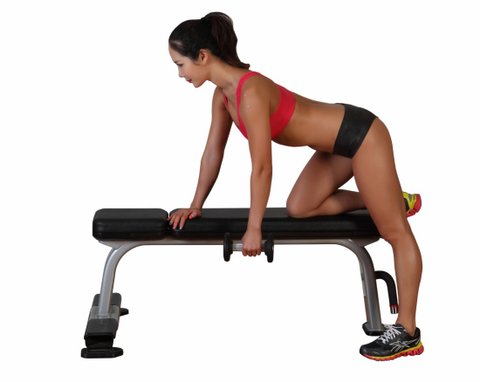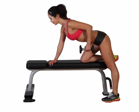 벤치 오른쪽에 서서 덤벨 하나를 자신의 앞에 놓는다. 왼쪽 손과 무릎, 정강이로 벤치를 짚고 몸을 앞으로 숙여 등이 바닥과 평행이 되도록 한다. 오른손으로 덤벨을 잡고 숨을 내쉬면서 힘차게 옆구리로 끌어 올린다. 다시 숨을 들이쉬면서 천천히 덤벨을 내린다. 이와 같은 동작을 왼손으로 실시한다.