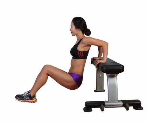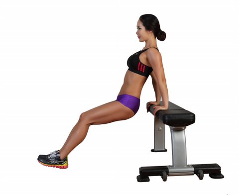 자신의 다리 길이보다 약간 짧은 거리를 두고 두 개의 벤치를 나란히 놓거나 벤치 하나를 두고 다리를 바닥에 내려놓는다. 한쪽 벤치의 모서리에 앉아 다른 쪽 벤치를 마주 본다. 양손으로 엉덩이 부분의 벤치 모서리를 잡고 양 뒤꿈치는 다른 쪽 벤치 위에 올린 뒤 엉덩이를 들어 올려 팔과 다리에 체중을 싣는다. 숨을 들이쉬면서 팔을 굽혀 팔꿈치가 어깨높이까지 오도록 천천히 몸을 내린다. 다시 숨을 내쉬면서 팔을 펴 몸을 원래 높이로 들어 올린다.