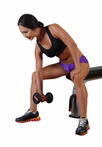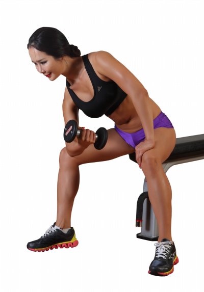 오른손에 덤벨을 잡은 채 끝 부분에 앉는다. 상체를 앞으로 조금 숙인 자세에서 오른팔의 삼두근을 오른쪽 허벅지에 대고 고정시킨다. 숨을 내쉬면서 왼쪽 어깨 쪽으로 힘차게 끌어 올린다. 다시 숨을 들이쉬면서 팔이 충분히 펴질 때까지 덤벨을 내린다. 오른손으로 한 세트를 끝낸 뒤에는 왼손으로도 동일한 훈련을 한다.