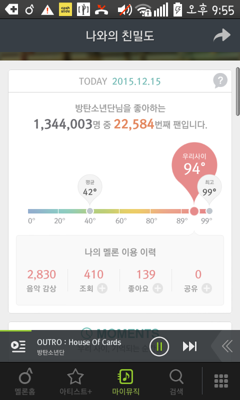 나 왜이렇게 안올라가는걸까? ㅠ ㅠ 하 정말루 내 아이디는 아이디기부해서 엄마껄로하고있는데 저거 음악 감상수다 이번 활동시기것만 되어있는거란말이야 어떤 아미는 나보다 음악 감상수도 적고 좋아요도 적은데 99도인데 ㅠ 별거 아니지만 나도 99도 ㅠ