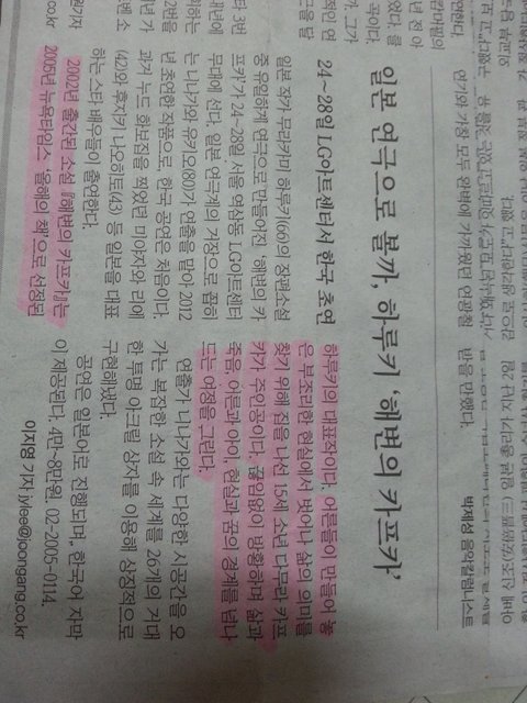 사진돌아갔네ㅠㅜ미앙..신문보다가 해변의카프카 단어듣고 움찔해서 읽어봤는데 진짜 소름이다.. 이게 소설이고 이런내용이라 버터플라이에 '나의 해변의 카프카여 저기 숲으로가진 말아줘'이런거구나ㅜㅜㅜ이제알았다.. 소설내용이랑 화양연화 내용이랑 똑같아서 진짜 학교에서 소리지를뻔함.. 무서워서 덕질하겠나..신문은 중앙일보꺼야!