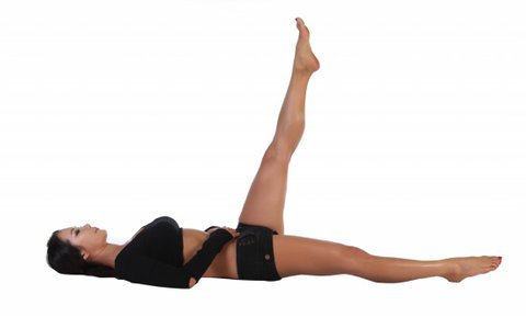 2-바닥에 누워 왼쪽 무릎을 세워 발뒤꿈치를 엉덩이 가까이 붙인다. 숨을 들이쉬고 오른쪽 다리를 위로 들어 올려 허벅지를 두손으로 깍지 끼어 잡는다. 숨을 내쉬며 무릎을 편 채 천천히 얼굴 쪽으로 당긴다.