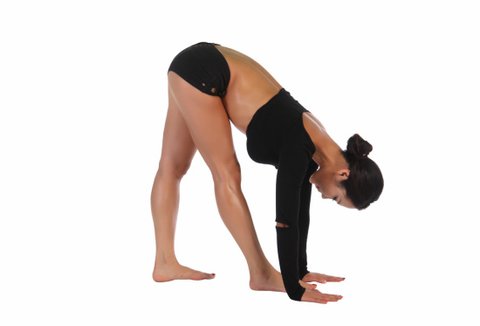 4-오른발을 30cm 정도 왼발 앞에 놓고 선다. 숨을 내쉬며 양쪽 무릎을 편 채로 윗몸을 앞으로 숙여 손이 바닥이나 오른발에 닿도록 한다.