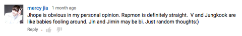 아영어좀 힘들어진다;; "제이홉은 개인적으로 게이가 확실해. 랩몬은 확실히 이성애자야. 뷔랑 정국은 그냥 노는 아이들같아. 진과 지민은 bl인거 같아. 그냥내 생각일 뿐이야."