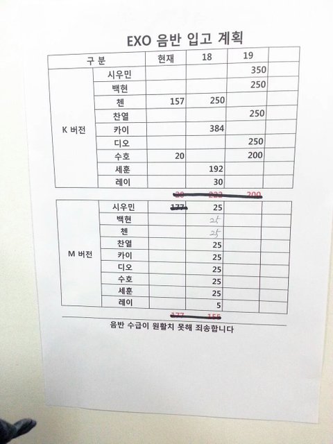 첸은 오늘 현재 남아있는 물량 체크 한거고 18일 19일에 입고 되는 수량 각각 체크 된거잖아...고로 첸은 다른 멤버들이랑 비슷한 수준으로 입고 된거고 저 표만 보면 카이가 제일 많이 입고 됨...