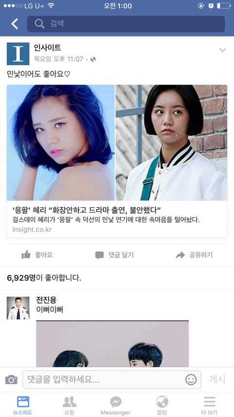 여기 여자들 진짜 이중잣대 장난아니다... 평소엔 기초제품,썬크림 아닌 다른 뭐라도 바르면 쌩얼아니라더니 여기보니깐 '저정도는 쌩얼이지', '쌩얼이나 다름없네'... 나도 평소 비비 립스틱 눈썹 컨실러만 하고다니는데 그럼 나도 쌩얼인가? 혜리라고 너무 봐준다. 나 혜리 좋아하고 응답하라시리즈 다 챙겨보는사람인데 여기여자들 작작좀 하자 이중잣대 질린다