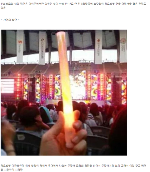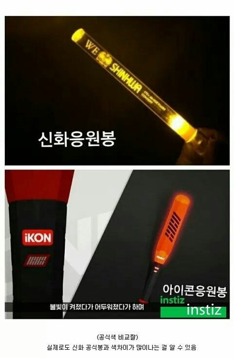 아이콘 응원봉의 색과 신화 응원봉 색은 확연히 다른데 여전히 지금도 욕먹는중. 사과는 정말 아주 극소수 팬들만 하고 아직까지도 머리채 잡히고있어..