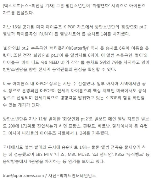 방탄소년단, 美 아이튠즈 K-POP차트 정상 석권