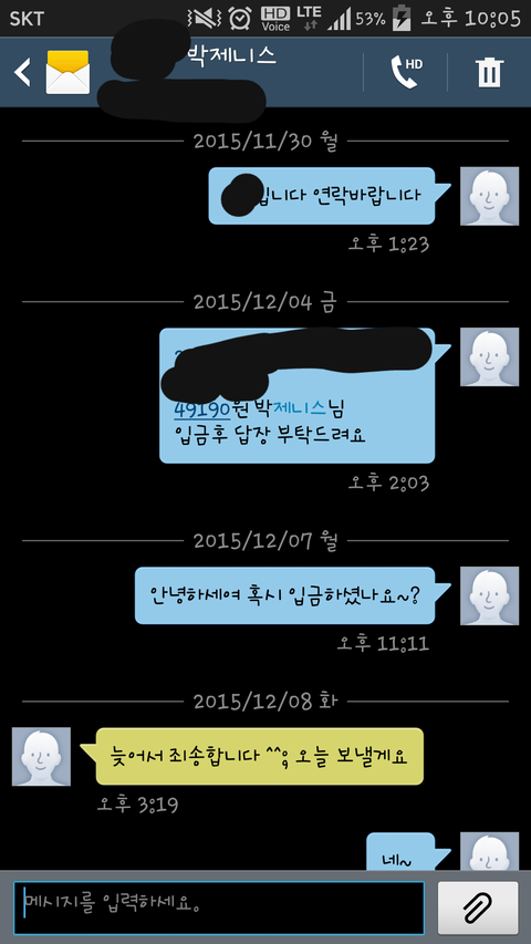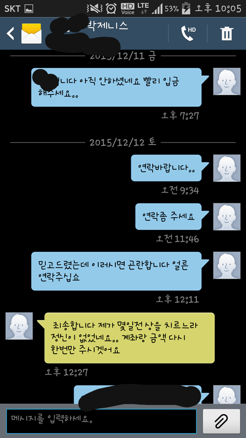 문자로 남겼습니다 그리곤 일을 끝내고 주말을 보냈습니다 그리고 월요일 입금후 답장이 없어 연락해보았지만 받질 않아 문자를 남겼습니다 그러자 그다음날 오후가 되서야 죄송하다 오늘은 보내겠다 하더군요 사람이 매너있게 느껴져서 또 믿고 기다렸는데 금욜(11일)까지도 입금이 안돼 있었습니다 이때부터 불안했습니다 연락은 아예 안되고 답장도 없고 설마 내가 속은걸까... 아냐 입금한다했으니 곧 하겠지.. 그렇게 토요일이 되서야 답장이 왔었습니다 정말 미안하다 상을 치러서 정신이 없었다면서.. 아 그럼 그렇지.. 사정이 있던거지.. 저는 안도의 한숨을 내쉬며 또 한번 주말을 보냈습니다