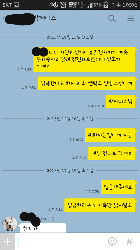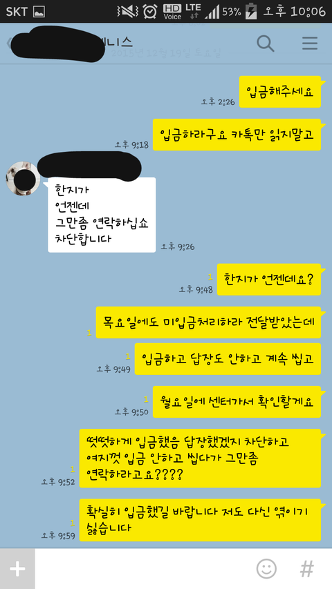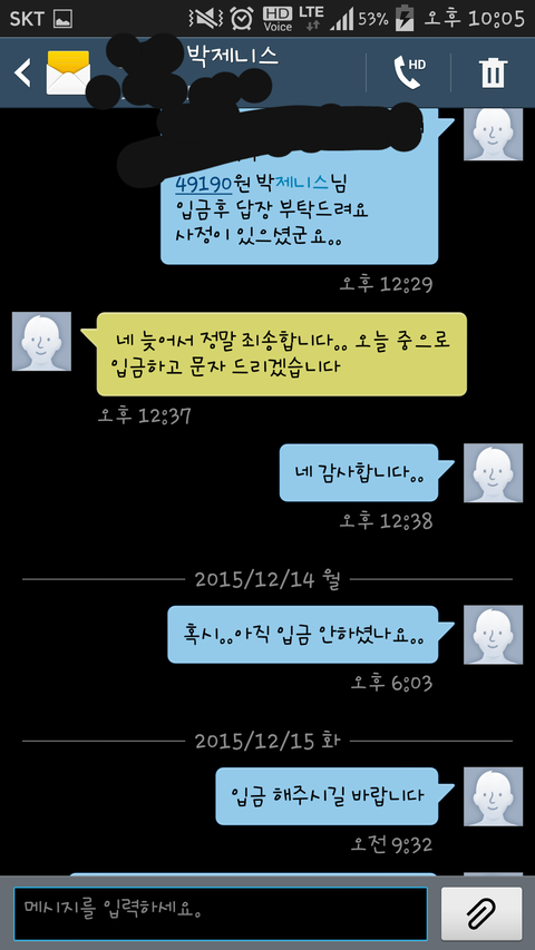 집앞에 찾아가서 쪽지도 붙이고 카톡은 차단이 안된거 같아 몇번 보냈는데 읽지를 않더라구요 그러다 오늘 읽은 표시가 떠서 또 보내니 그때서야 입금했으니 연락좀 그만하라더군요