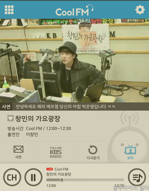 이름 그대로 창민의 가요광장으로 들어가서 일반모드(간편모드 안됨) 상태에서 들어간 후에 옆에 보라 라는 버튼 있어. 그거 누르면 보이는 라디오라서 방탄이들 볼 수 있고 보라 버튼 안누르면 그냥 목소리만 듣는거야.