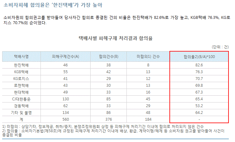 한편 소비자피해 합의율은 '한진택배'가 가장 높았습니다!