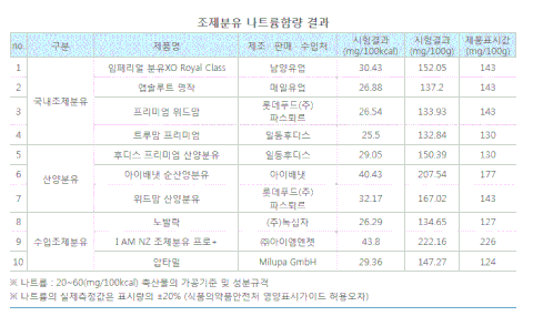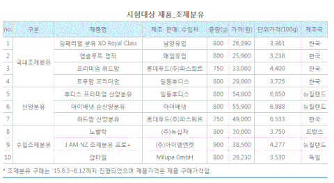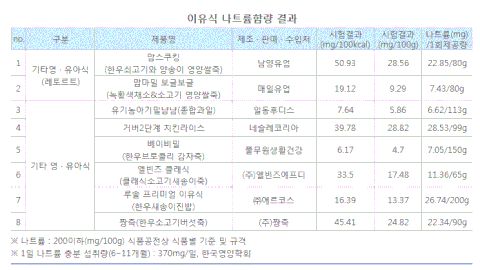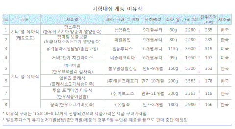 조제분유(1단계:0~6개월) · 국내조제분유(4종) : 임페리얼 XO(남양유업), 앱솔루트 명작(매일유업), 파스퇴르 프리미엄 위드맘(롯데푸드), 트루맘 프리미엄(일동후디스) · 수입조제분유(3종) : 노발락(녹십자), I AM NZ 조제 분유 프로+(아이엠엔젯), 압타밀* (Milupa GmbH)· 산양분유(3종) : 후디스 프리미엄 산양분유(일동후디스), 순산양분유(아이배냇), 파스퇴르 위드맘 산양분유(롯데푸드)* 수입조제분유 압타밀은 현재 국내 정식 수입원이 없으므로 해외구매대행을 이용하여 제품을 구매함 이유식(6개월~12개월)· 레토르트*(2종) : 맘스쿠킹/한우쇠고기와 양송이 영양쌀죽(남양유업), 맘마밀 보글보글/녹황색채소&소고기 영양쌀죽· 국내제조이유식(4종) : 베이비밀/한우브로콜리 감자죽(풀무원생활건강), 엘빈즈 클래식/클래식소고기새종이죽(엘빈즈에프디), 루솔 프리미엄 이유식/한우새송이진밥(에르코스), 짱죽/한우소고기버섯죽(짱죽)· 수입제조이유식(2종) : 유기농아기밀 냠냠/종합과일(일동후디스), 거버 2단계/치킨라이스(네슬레코리아)* 레토트르 제품: 조리가공한 여러 가지 식품을 일종의 주머니에 넣어 밀봉한 후 고압가열살균솥(retort)에 넣어 고온에서 가열살균하여, 공기와 광선을 차단한 상태에서 장기간 식품을 보존할 수 있도록 만들어 저장을 목적으로 한 가공식품 ** 이유식의 종류는 쇠고기가 함유된 제품을 기본으로 하였으며, 쇠고기 함유제품이 없는 경우 섭취월령에 맞춰 섭취가 가능한 제품으로 선정