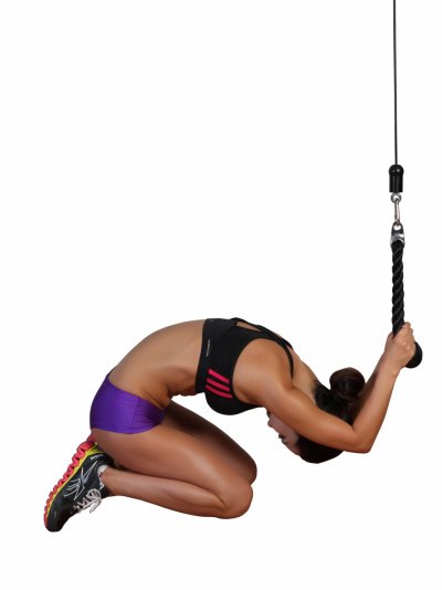 로프를 위쪽 케이블에 연결한다. 머신을 등지고 서서 로프의 양 끝을 잡고 귀 근처까지 끌어 내린다. 바닥에 무릎을 꿇고 엉덩이는 발뒤꿈치로 받친다. 숨을 내쉬면서 상체를 앞으로 숙여 로프를 끌어 내린다. 다시 숨을 들이쉬면서 상체를 바로 세운다.