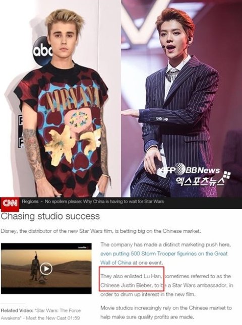지난 18일 미국 CNN은 "'스타워즈7'는 왜 중국 관객들을 기다리게 했을까"라는 기사에서 영화 '스타워즈: 깨어난 포스'의 중국 홍보대사인 루한을 '중국판 저스턴 비버'라고 비유했다.