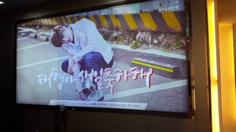 태형이 생일전광판 보고왔음 버스랑 나머지1개는 시간없어서 못봤는데 저거도 놀면서찾다가 지쳐서 집가려는데 앞에가는 커플이 방탄소년단~@#!##하면서 얘기하고있길래 개뛰어가서 급하게사진찍고 지금 지하철... 절도하고싶었는데 매우 시무룩스 아무튼 저런식으로 애들 밖에서보니까 너무기뻤어
