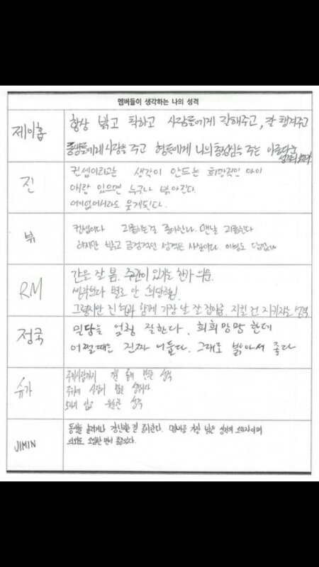 첫번째는 호석이가 생각하는 자기 성격이고, 밑에는 전부 각자 멤버들이 생각하는 호석이의 성격이야.