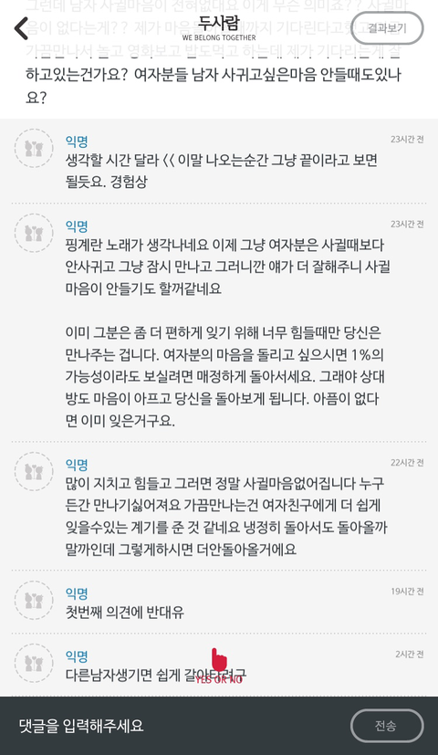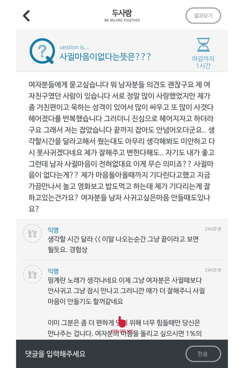 제가 여자친구랑 같이 쓰는 어플에 이 고민을 올렸더니 댓글이 너무 부정적이예요.원래 커플끼리만 쓰는데라서 부정적인 댓글 많이 없는데도커플인 사람들이 저런 식으로 반응하는거면..정말 가망이 없는건가요?