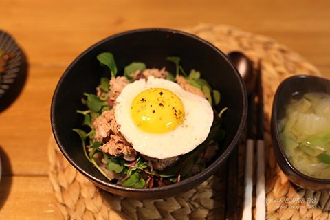 요리도 외식도 귀찮다 할땐 그냥 채소 > 고추장 > 캔참치 > 계란 올려 비벼먹기