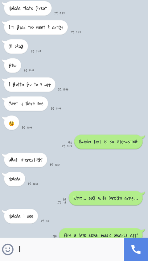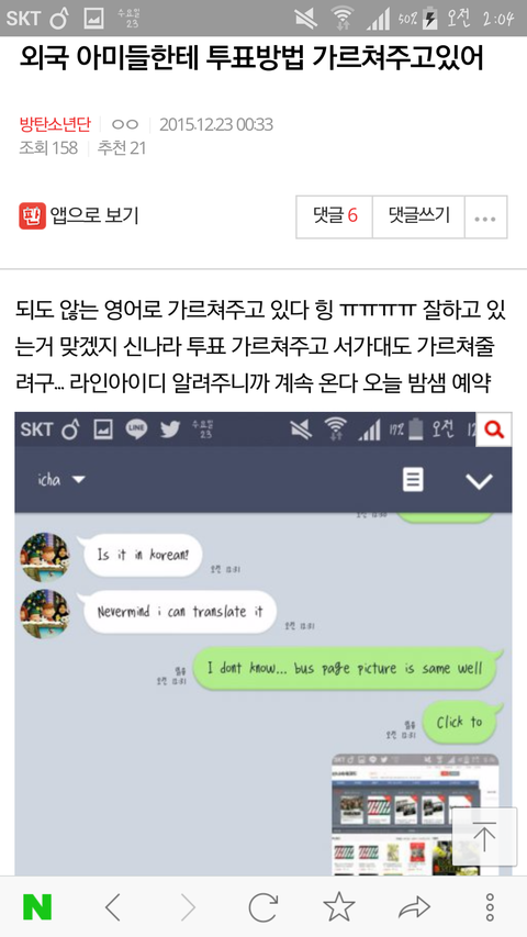 공카 유출하는 건 나도 싫다 그건 말이 잘 안통했어 예전에 외국 아미랑 그거 가지고 좀 다툰적 있었거든 헿 v앱 채팅에서 막 한국아미라고 반갑다고 하니까