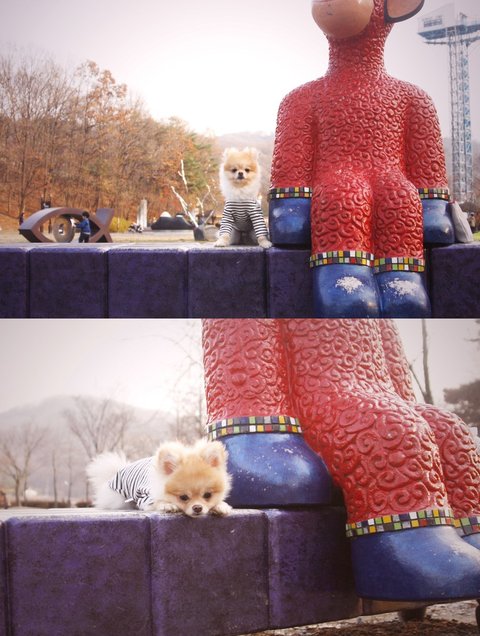 사진 찍고 바로 벗겨줬어요~~지금은 산책할 때마다 옷 입히는데 곧잘 적응해서 입고 다녀요!