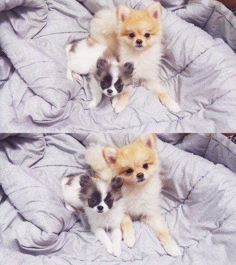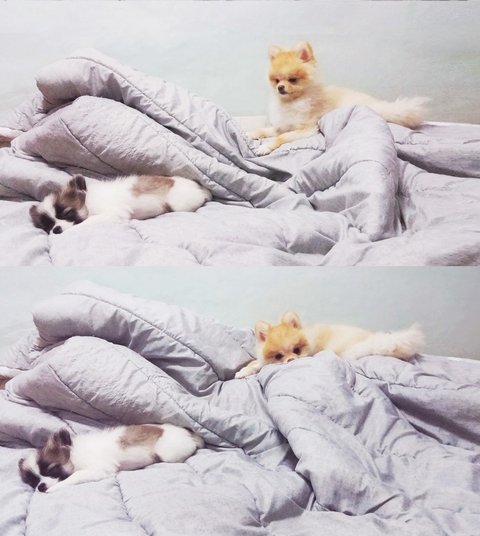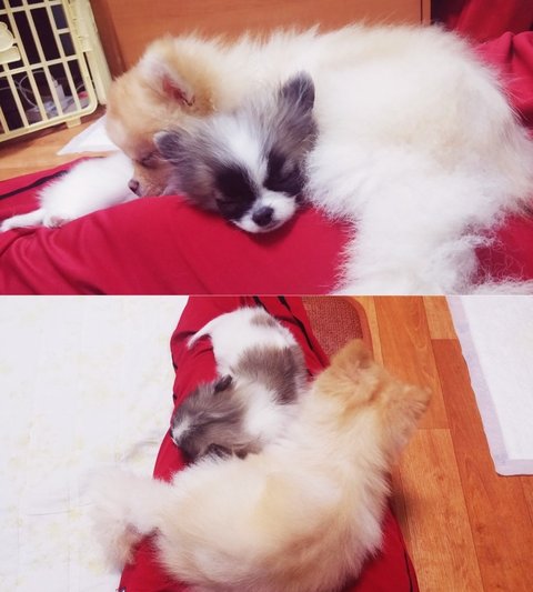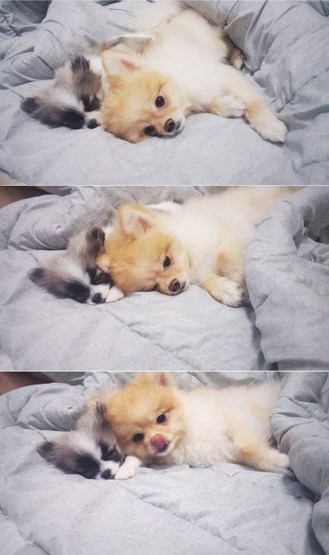 뒷모습 찍어주려 앉혀놨더니 슈가 갑자기 크림이한테 기대서 졸아요ㅎㅎㅎ