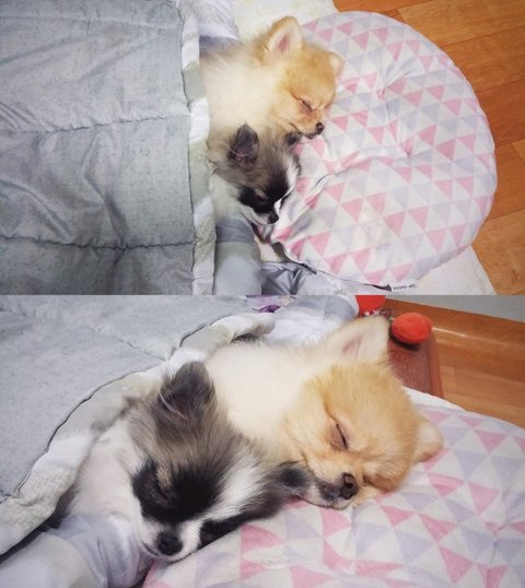 산책 후엔 항상 둘이 붙어서 꿀잠자요