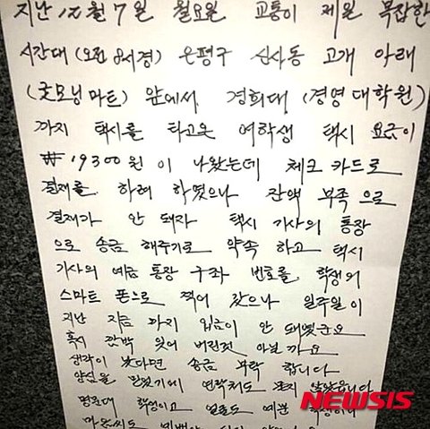 이어 "양심을 믿었기에 연락처도 묻지 않았다"며 "명문대 학생이고, 얼굴도 예쁜만큼 마음씨도 예뻐야 되지 않겠냐"고 했다. 손으로 쓴 벽보에는 택시기사의 억울한 사연이 그대로 담겨 있다. 벽보 사진은 온라인을 통해 퍼져나가고 있다.