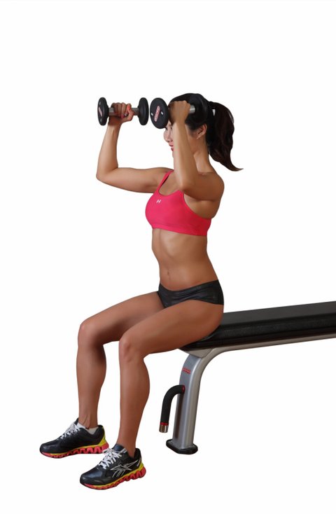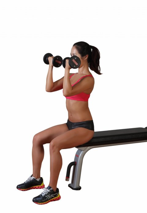 자리에 앉아서 양손에 덤벨을 하나씩 들고 허벅지 위에 올려놓는다. 덤벨을 어깨 바로 위까지 들어 올리고, 손바닥은 몸 쪽으로 향하도록 한다. 숨을 내쉬면서 덤벨을 들어 올려 손바닥이 앞쪽을 향하게 한다. 숨을 들이쉬면서 천천히 덤벨을 내리고, 손바닥은 다시 자신의 몸 쪽을 향하도록 돌린다.