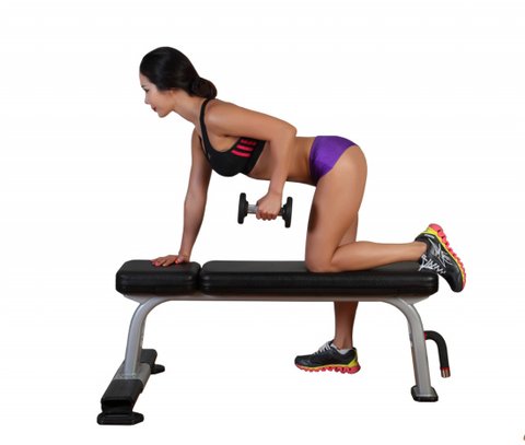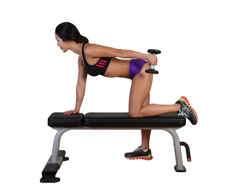 벤치 오른쪽에서 서서 덤벨 하나를 앞에 놓는다. 왼쪽 무릎과 정강이를 벤치 위에 올리고 상체를 앞으로 숙인다. 왼손으로 벤치를 짚고 등이 바닥과 수평이 되도록 한다. 오른손에 덤벨을 잡고 손바닥이 몸 쪽을 향하도록 손목을 돌린다. 상완은 바닥과 평행하도록 맞추고, 팔꿈치는 옆구리 근처에 고정시킨다. 이것이 시작 지점이다. 팔꿈치를 고정시킨 채 숨을 내쉬면서 팔을 뒤로 완전히 편다. 다시 숨을 들이쉬면서 덤벨을 시작 지점에서 되돌린다. 오른손으로 한 세트를 끝낸 다음에는 왼손으로 위와 동일하게 훈련한다.