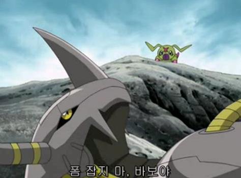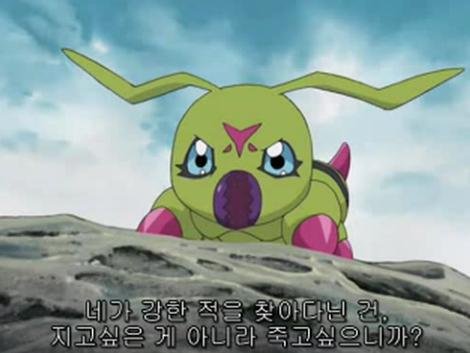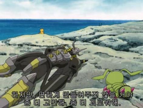 아라크네몬을 감싸는 태일일행을 이해 못하는 블랙워그레이몬