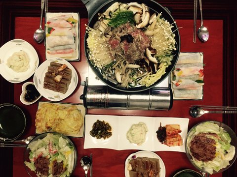 불고기전골, 도토리묵, 동태전, 떡갈비샐러드, 무쌈말이랑 기본반찬들 ㅎㅎ