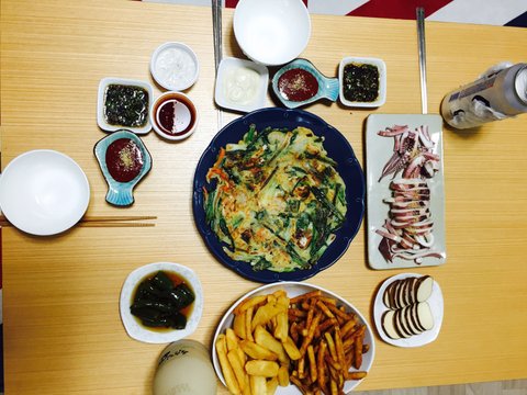 이건 해물파전이랑 감자튀김(이건 사왔어요 감우지에서 ㅋㅋ), 오징어 숙회를 간단하게 해서